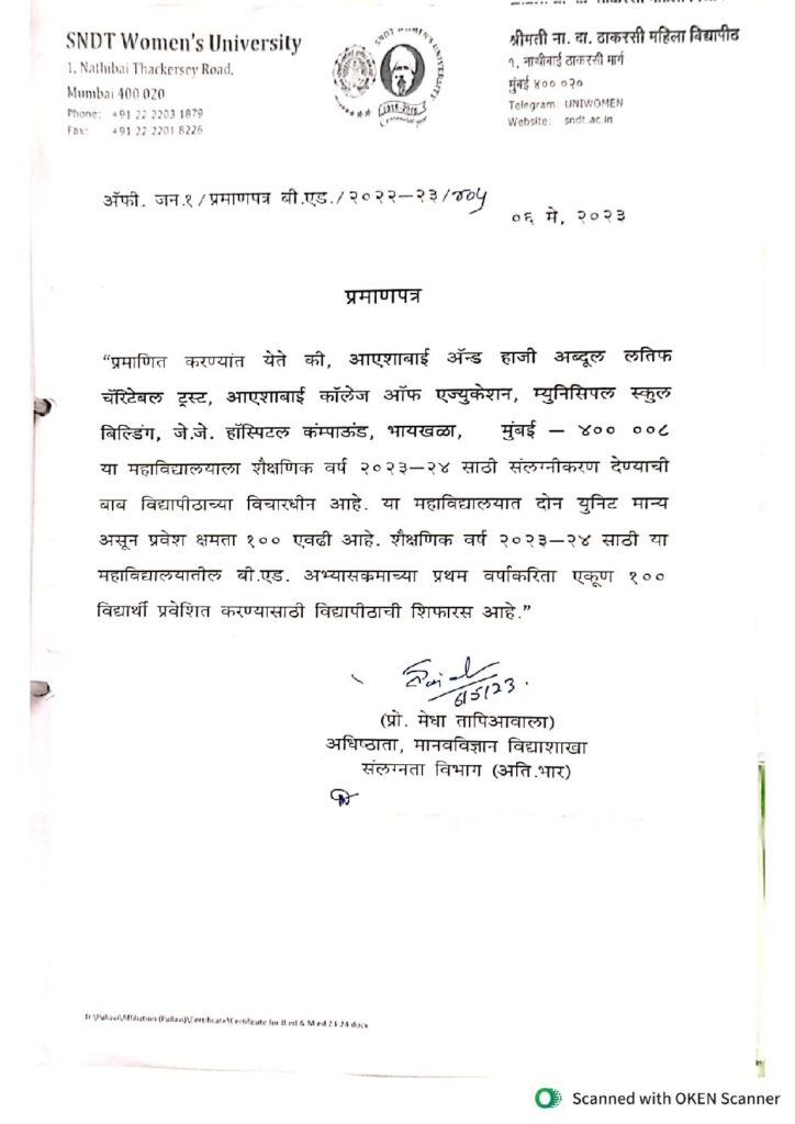 Affiliation Letter for the A.Y. 2023-24 (From SNDT Women's University)