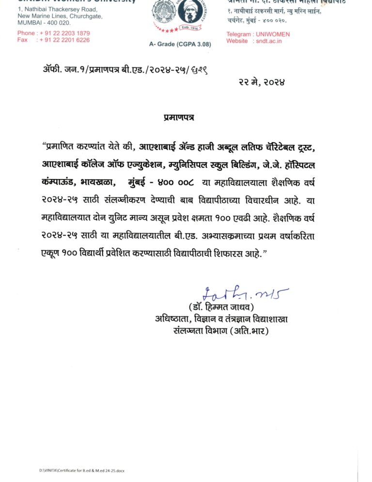 Affiliation Letter for the A.Y. 2024-25 (From SNDT Women's University)
